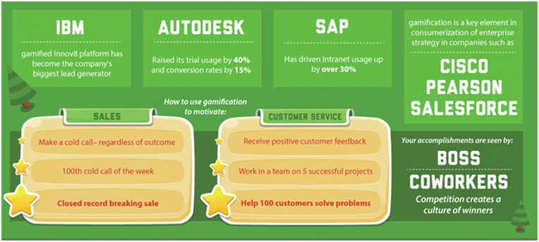 Big sharks in technology realm like IBM, Autodesk, SAP, Cisco, Pearson, and Salesforce, etc. are using gamification as their strategy nowadays because they are well aware of the fact that it is the key in consumerization of enterprises while making their strategies. The accomplishments achieved by gamification are seen by your bosses and coworkers bringing a positive and employee friendly environment in work place. The best part of gamification is, it gives boost to sales and customer service operations in companies.