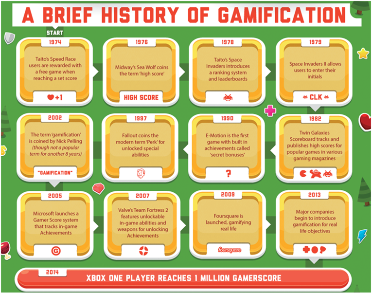 Since 1974, gamification is being used by companies and businesses to transform their business operations. You can see a glimpse of gamification history in the image given above. Plus you can also see with the use of gamification XBOX one player reaches to 1 million gamerscore in 2014.